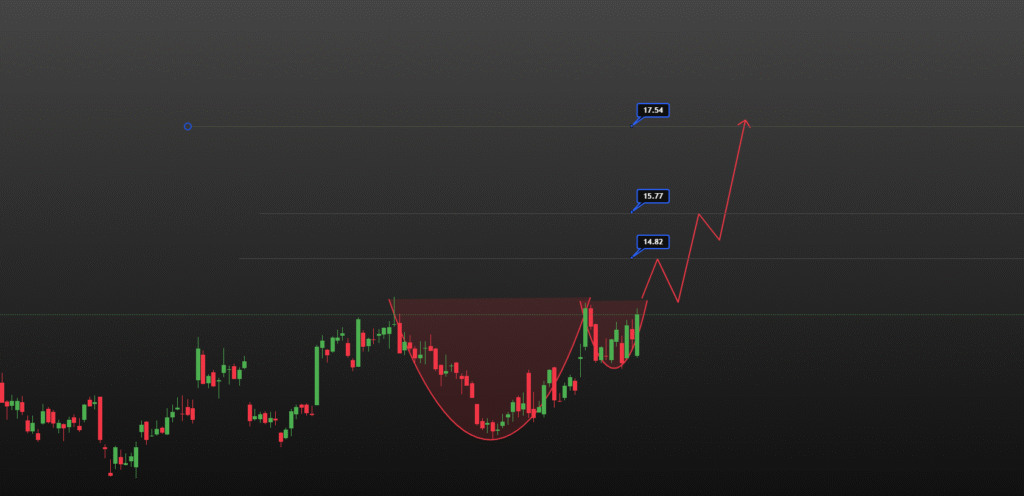 • پس از شکست و تثبیت، حرکت مرحلهای به سمت 14.82 → 15.77 → 17.54 محتمل است.