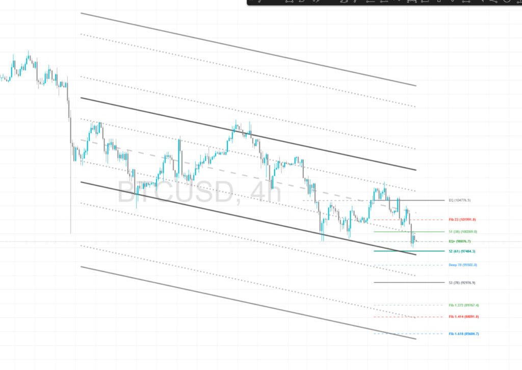در تایمفریم 4 ساعته بیتکوین، قیمت همچنان داخل ساختار نزولی اندیکاتور Phoenix Magic Channel در حرکت است. رفتار قیمت کاملاً مطابق با خطوط اصلی، یکچهارم و یکهشتم کانال پیش میرود و نشان میدهد که بازار بهصورت کاملاً هندسی نسبت به این سطوح واکنش میدهد.