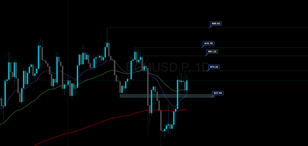 در تایمفریم روزانه، بیتکوین کش بعد از اصلاح اخیر، تونسته بالای ناحیهی حمایتی 527 دلار تثبیت بشه. این ناحیه همون Demand Zone قویه که بارها باعث برگشت قیمت شده. کندلهای اخیر نشون میدن که خریدارها دوباره کنترل بازار رو در دست گرفتن.