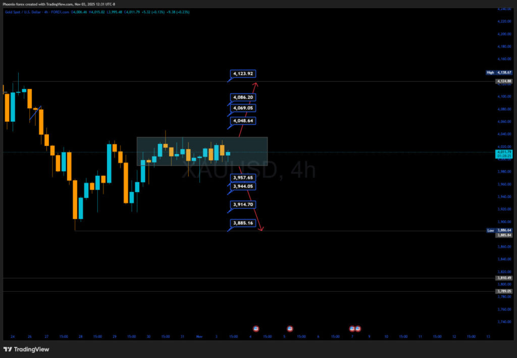 در تایمفریم ۴ ساعته، قیمت طلا پس از رشد اخیر وارد فاز تراکم (Consolidation) شده و در یک باکس رنج بین ۳۹۹۰ تا ۴۰۳۴ نوسان میکند.