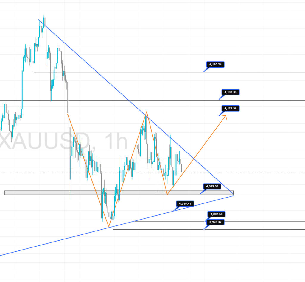 در تایم یکساعته، طلا داخل یک الگوی مثلث فشرده (Symmetrical Triangle) قرار دارد و همزمان یک الگوی دابلوی (W) هم در کف ساخته که ماهیتش صعودی است.