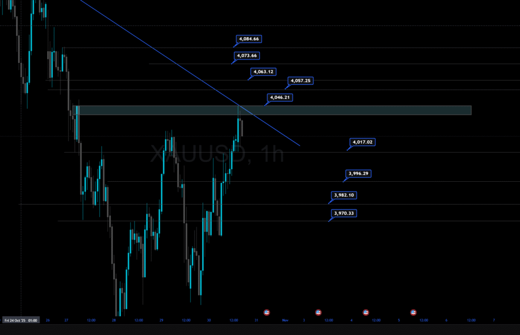 طلا تو تایمفریم یکساعته بعد از اینکه محدودهی ۴۰۳۰ دلار رو شکست، الان رسیده به یه محدودهی خیلی حساس نزدیک ۴۰۵۰ دلار که دقیقا روی خط روند نزولی اصلی قرار گرفته. این محدوده نقش کلیدی داره و میتونه تعیینکنندهی جهت بعدی بازار باشه.