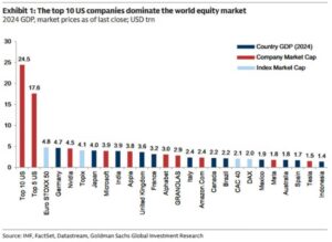 رزش ۱۰ سهام برتر آمریکا حالا به ۲۴.۵ تریلیون دلار رسیده — یعنی ۵ برابر کل سهام شاخص Euro Stoxx 50 اروپا! این رقم حدوداً ۵ تا ۶ برابر بزرگتر از اقتصاد آلمان و ژاپنه، و فقط ۵ شرکت اول آمریکا از نظر ارزش بازار، از مجموع اقتصاد آلمان، ژاپن، هند و بریتانیا هم بزرگترن! 🇺🇸 سهامهای بزرگ آمریکایی دارن بر بازار جهانی سلطه پیدا میکنن